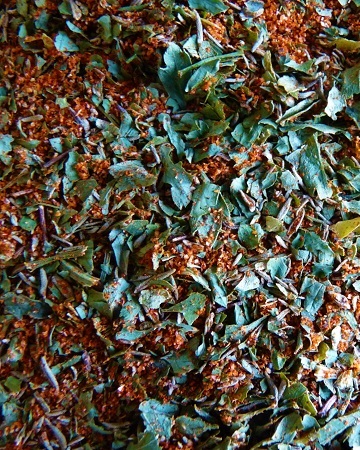 Mélange élaboré par mes soins. Ingrédients : Paprika, thym, origan, poivre noir, cumin, moutarde, piment.